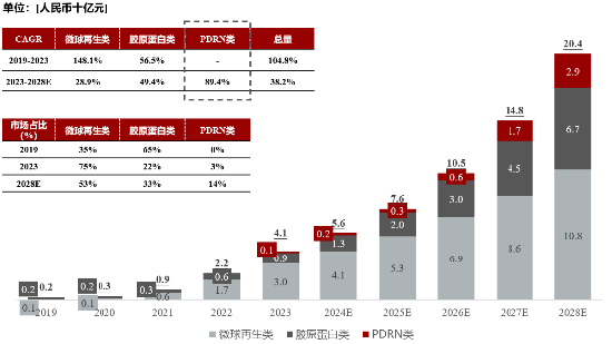 微球再生类是目前及未来最大的细分市场。微球再生类在2019年的市场规模为0.8亿元人民币,在医美再生抗衰注射剂市场占比为35%。随着新产品不断上市,2023年,其市场规模增至为30.3亿元人民币,市场占比增至75%。预计2028年,市场规模将进一步增长至107.7亿元人民币。