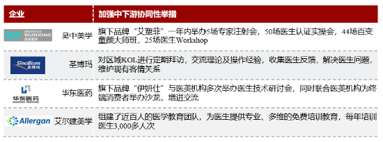消费者对机构或医生的专业性考量、医美机构的客户留存与拓新是下游市场最大痛点,近年中游厂商通过KOL教育不断增强中下游协同性,利于提高注射医生水平的同时,及时获得临床反馈,实现全产业链良性闭环。