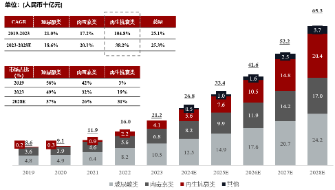 以出厂价计,2023年中国医美注射剂市场规模达212亿元人民币,预计2028年将增加至653亿元人民币,期间年复合增长率为25.3%;其中,再生抗衰类的市场占比将从2019年的3%,预计于2028年增至31%。