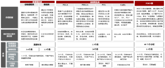主要以胶原蛋白类、微球再生类和PDRN类材料为主,通过刺激人体自身胶原蛋白的再生从而起到美容抗衰的作用,具有在胶原蛋白生成速度、维持时效、可降解性以及个性化定制等方面的优势。
